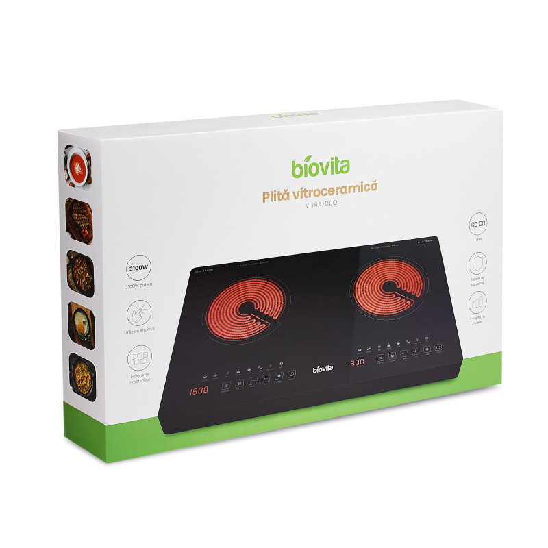 Plita vitroceramică VITRA-DUO are o putere totală de 3100W distribuită pe 2 zone de gătire. Zona din stânga oferă o putere maximă de 1800W, perfectă pentru preparatele care necesită temperaturi înalte, în timp ce zona din dreapta cu 1300W este ideală pentru gătirea delicată sau menținerea la cald. Această configurație îți permite să gătești eficient și să economisești timp în bucătărie.