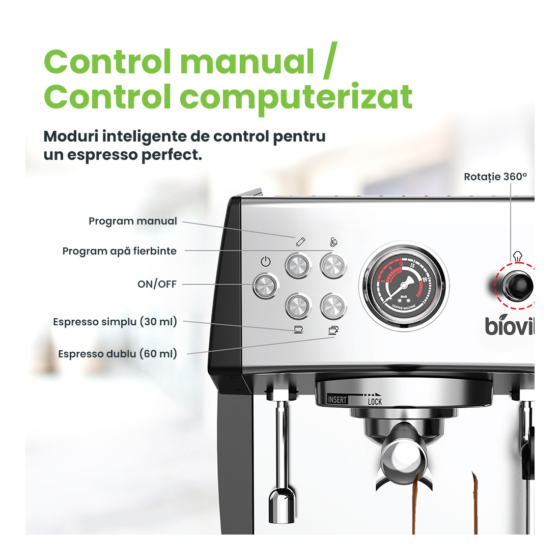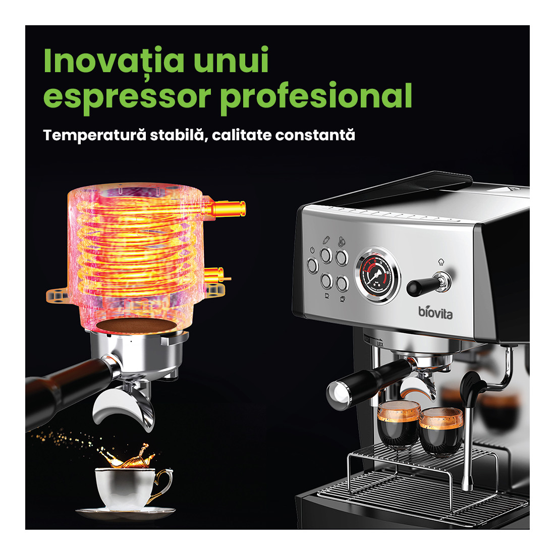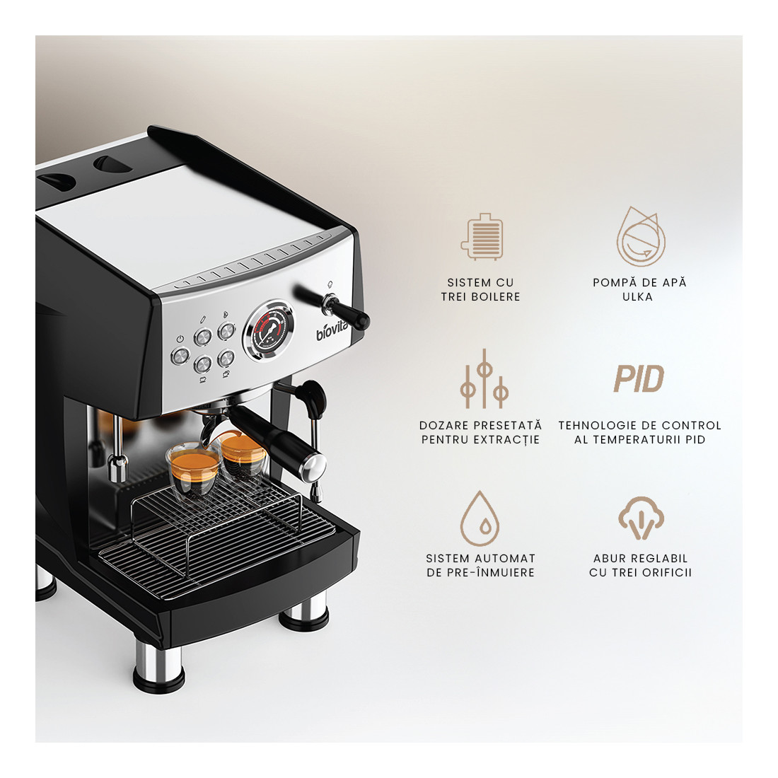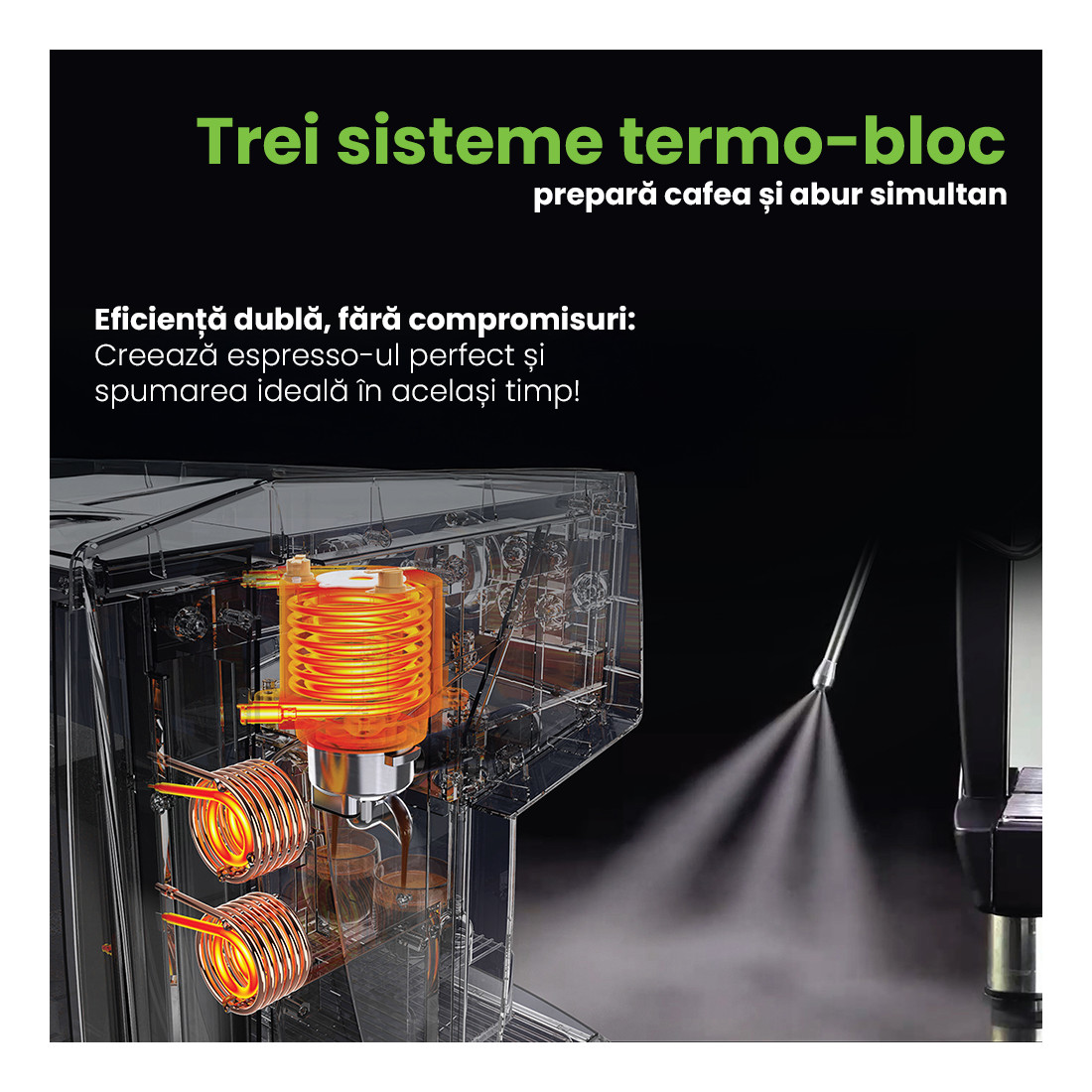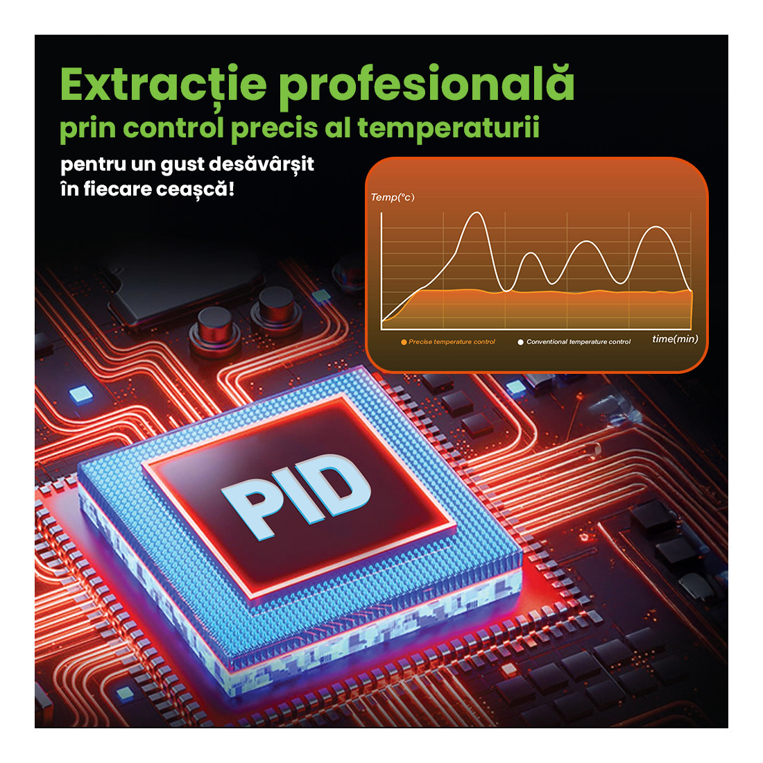 Controlul perfect al temperaturii devine realitate prin tehnologia avansată PID și cele trei sisteme termo-bloc independente. Acum poți extrage aroma completă din fiecare tip de cafea, menținând temperatura constantă pe tot parcursul procesului de preparare.