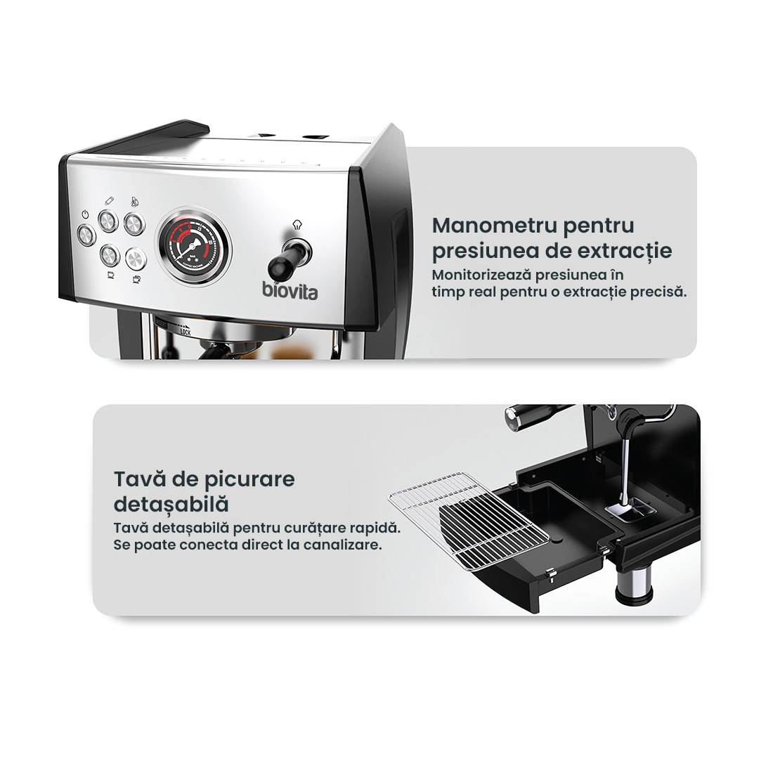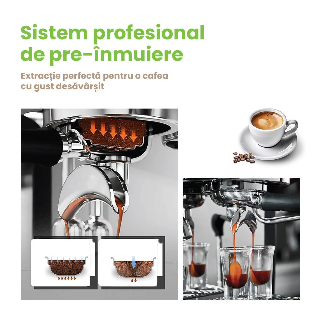 Sistemul de înaltă presiune de 20 bari, împreună cu pompa profesională Ulka, asigură extracția optimă a cafelei. Pre-infuzia automată permite boabelor să se dezvolte complet înainte de extracție, rezultând un espresso perfect echilibrat, cu cremă bogată.
