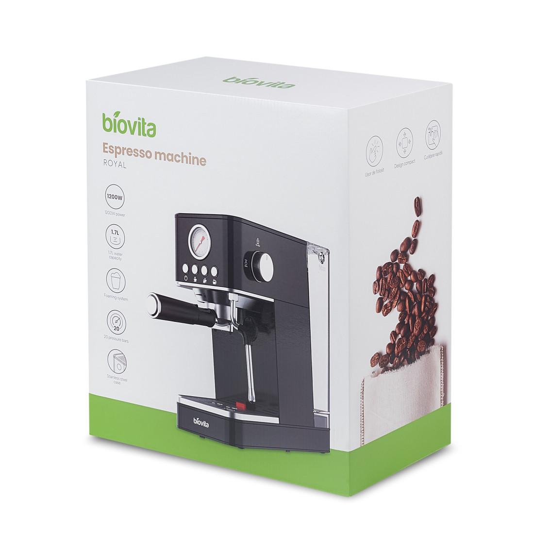 Acest model este ușor de folosit și de curățat, iar carcasa din inox îi dă un aspect clasic și minimalist. Bucurați-vă de beneficiile unei cafele de calitate și savurați băuturile preferate într-un mod rapid și ușor cu espressorul ROYAL.