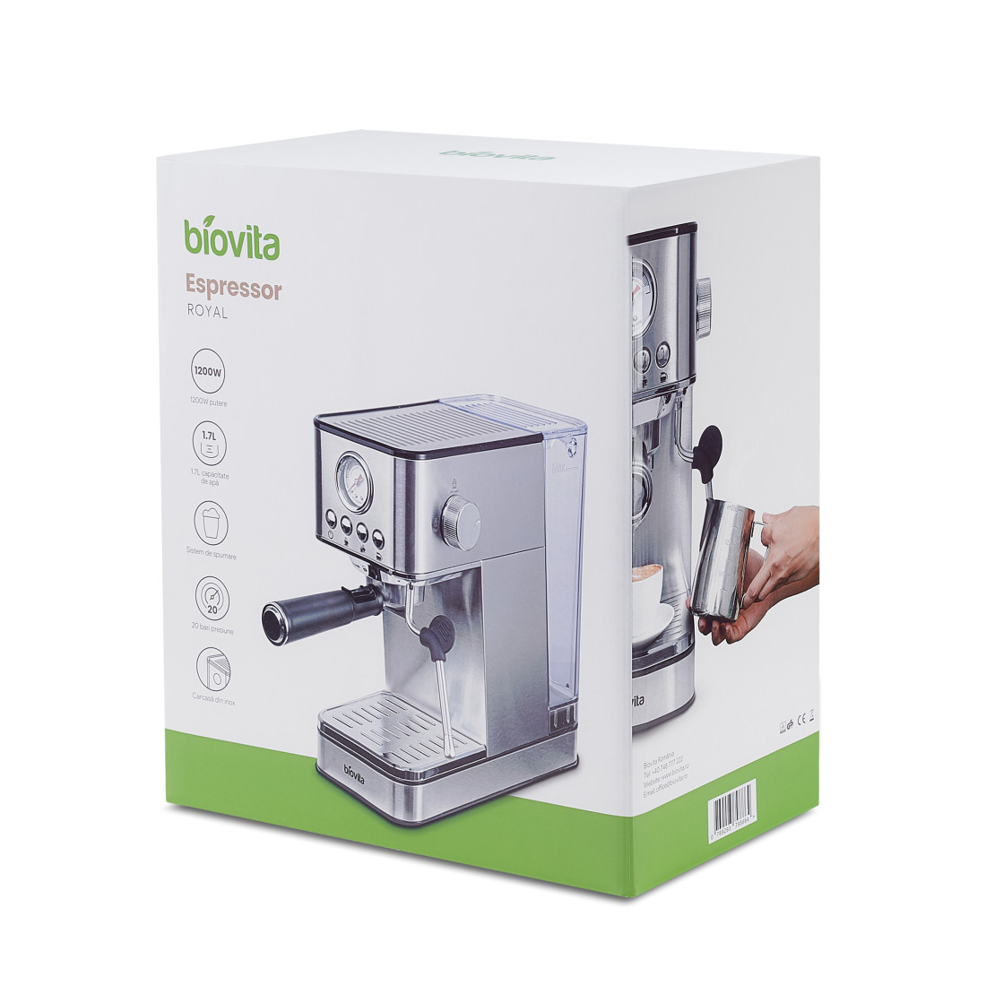 Espressorul ROYAL vă oferă o soluție rapidă și ușoară de a vă bucura de un espresso de calitate și alte băuturi pe bază de cafea. Cu o putere de 1200W și o capacitate de 1.7L de apă, acest espressor este ideal pentru a prepara o varietate de cafea, de la espresso până la cappuccino, latte sau macchiato. Sistemul de spumare asigură o spumă densă și catifelată, care îmbunătățește gustul și aspectul fiecărei băuturi.