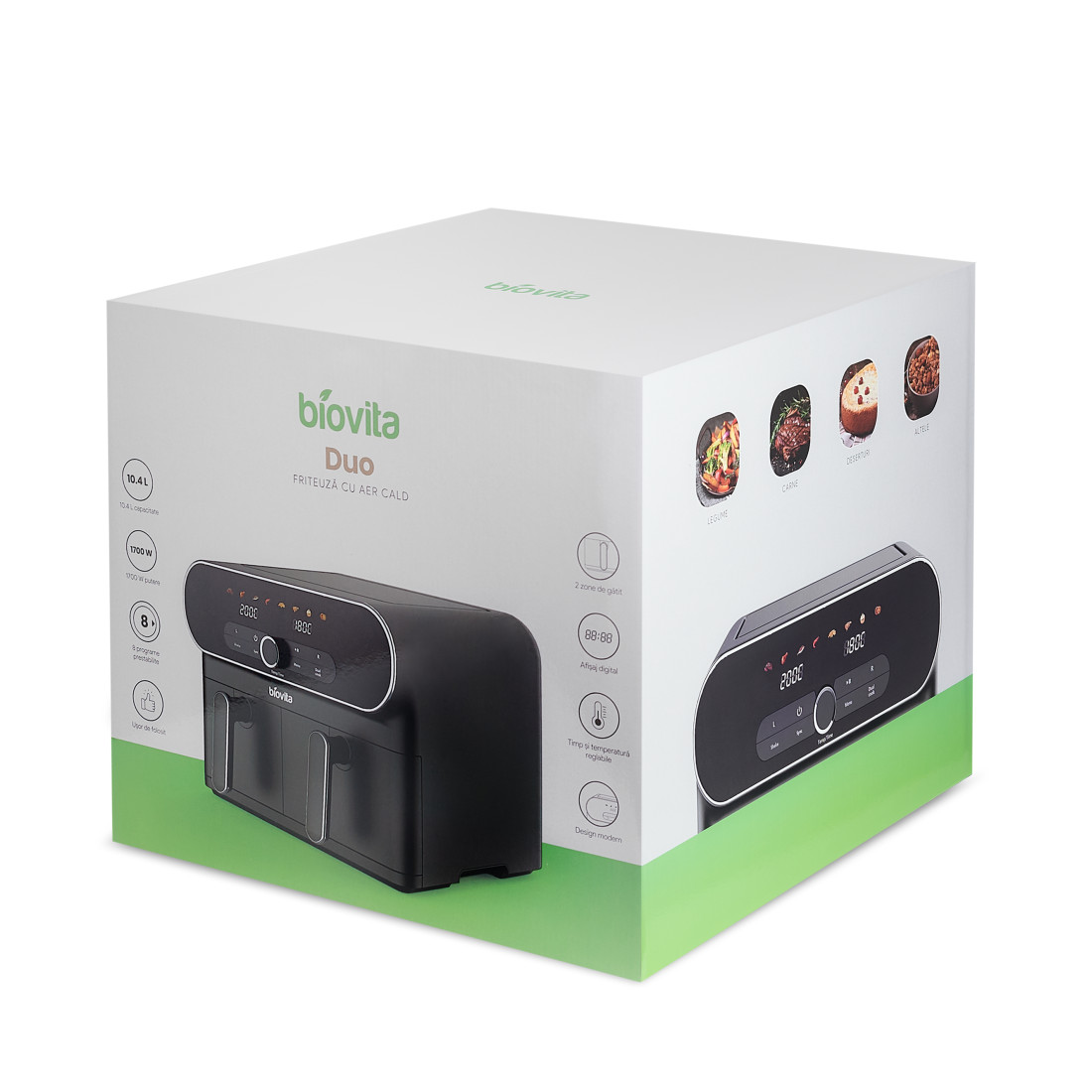 Capacitatea generoasă de 10.4L vă permite să gătiți cantități mari de mâncare pentru întreaga familie. Fie că preparați cartofi prăjiți pentru o petrecere, pui crocant pentru cină sau prăjituri delicioase pentru desert, DUO vă stă la dispoziție cu o capacitate impresionantă.