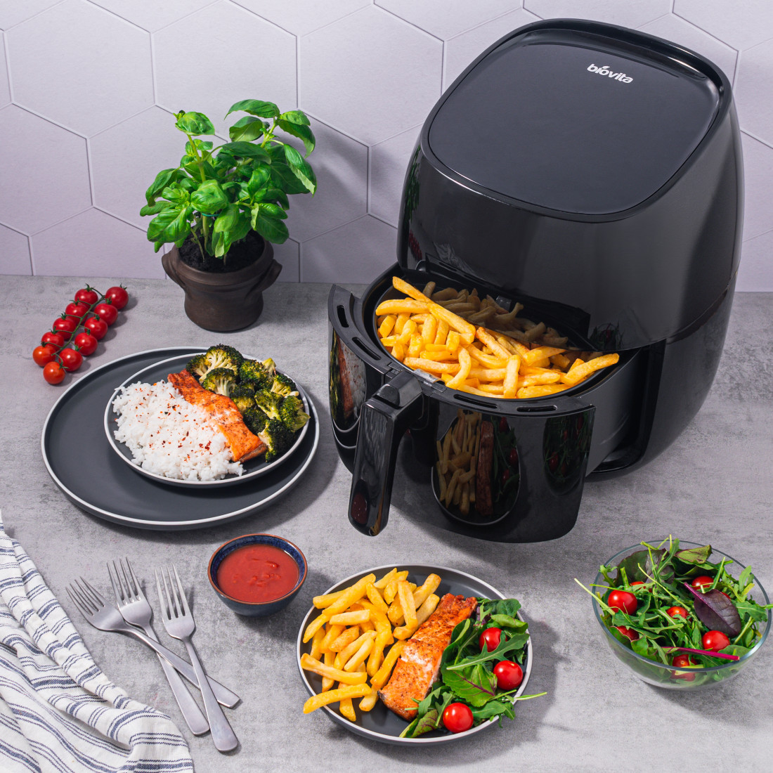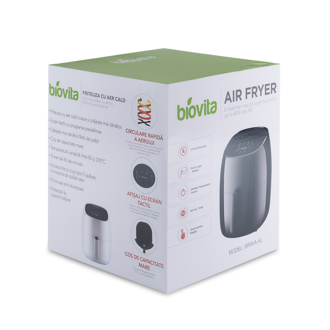 Friteuza cu aer cald Biovita Brava-XL are o capacitate de 5.5 L, fiind suficient de mare încât să gătești pentru toată familia, chiar și pentru musafiri. Poți prăji deodată până la 1.4 kg de cartofi pai. Aerul fierbinte circulă rapid, asigurând o prăjire rapidă și uniformă. Friteuza te ajută să gătești o gamă largă de rețete: gustări, legume, carne, pizza și altele. Pregăteste-te să te bucuri de mâncărurile preferate, acum într-o variantă mai sănătoasă, dar la fel de gustoasă.