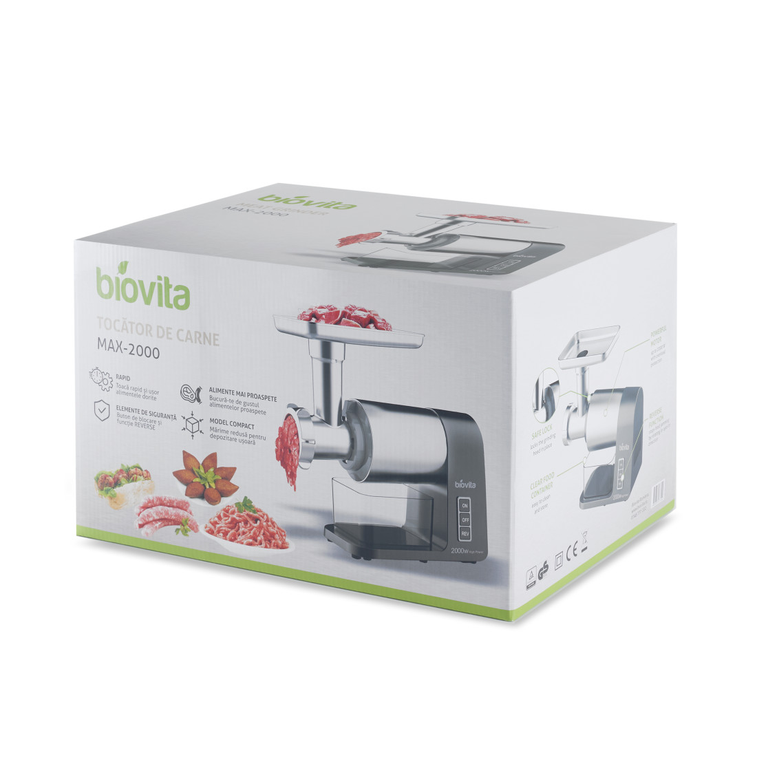 Masina de tocat MAX-2000, 2000W, angrenaje metalice, cuțit din inox, 3 site, cu Reverse, 1.8 kg/min