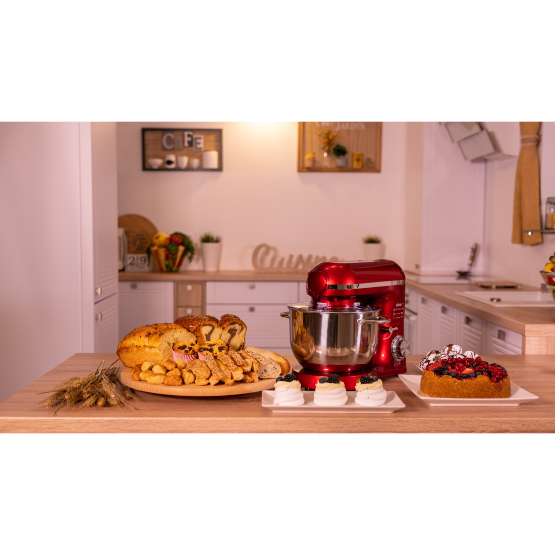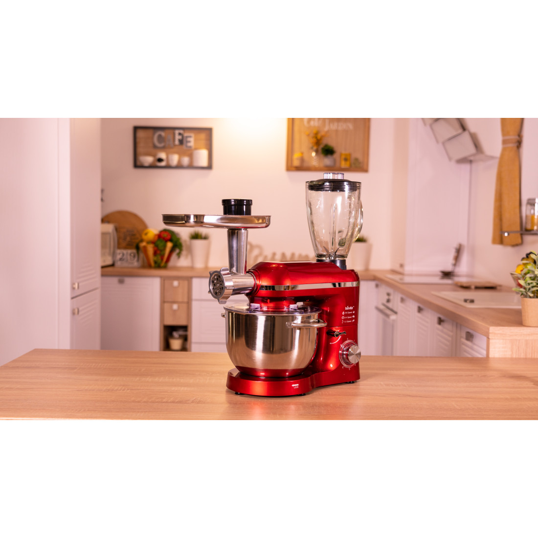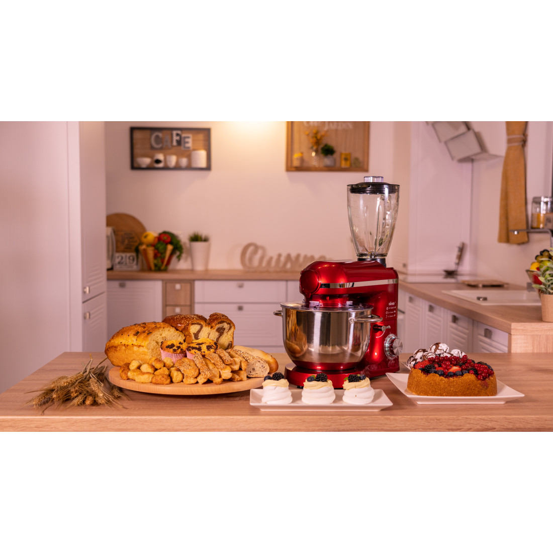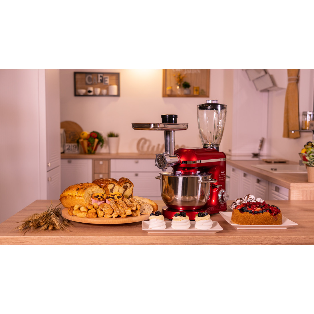 | Accesorii | Tel din inox, cârlig pentru frământare, paletă pentru amestecare, tocător, blender |