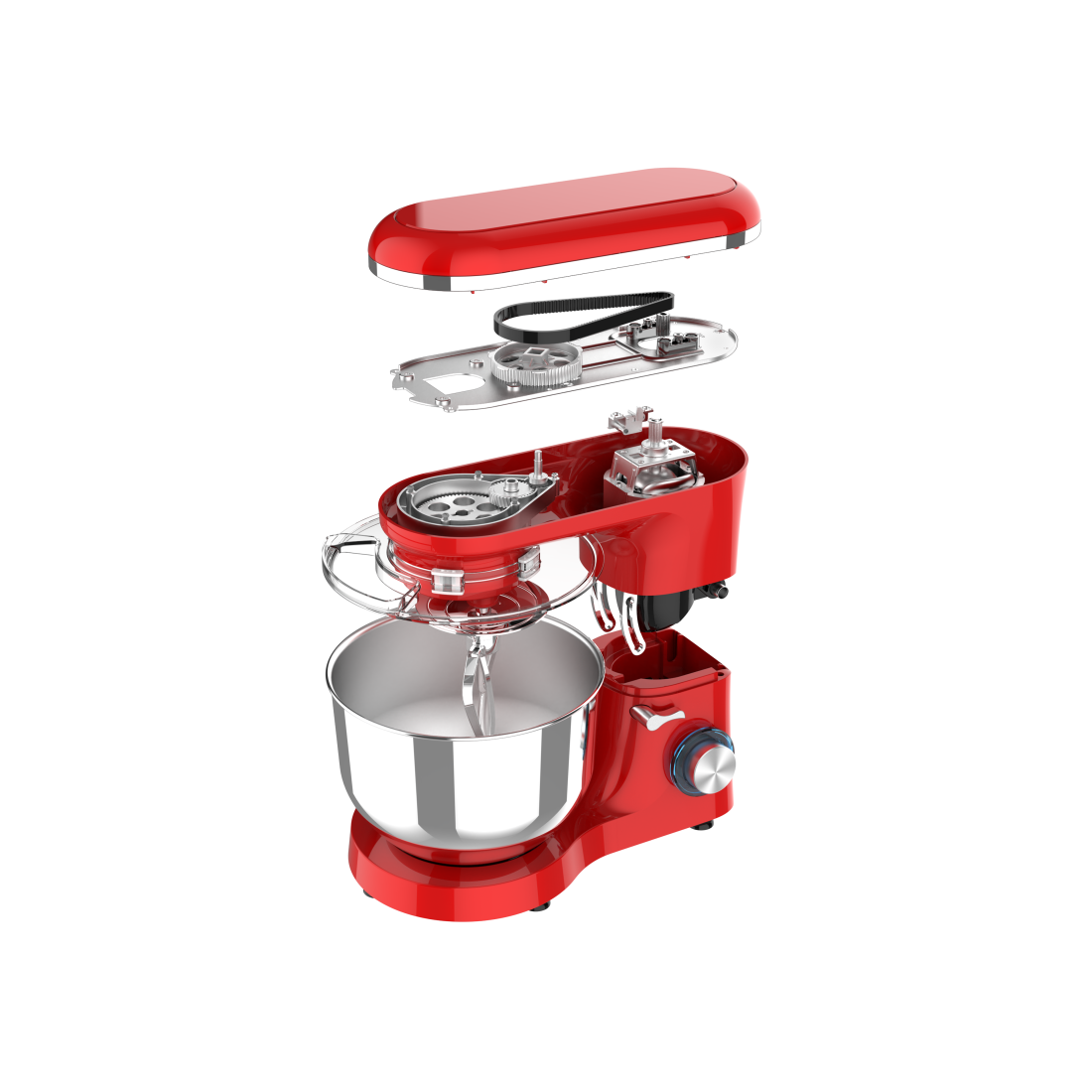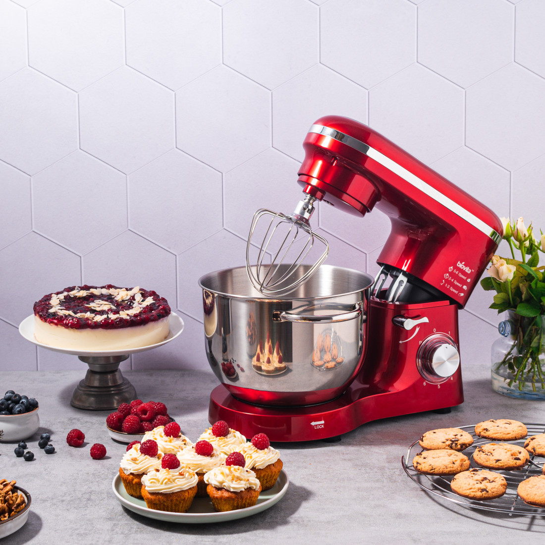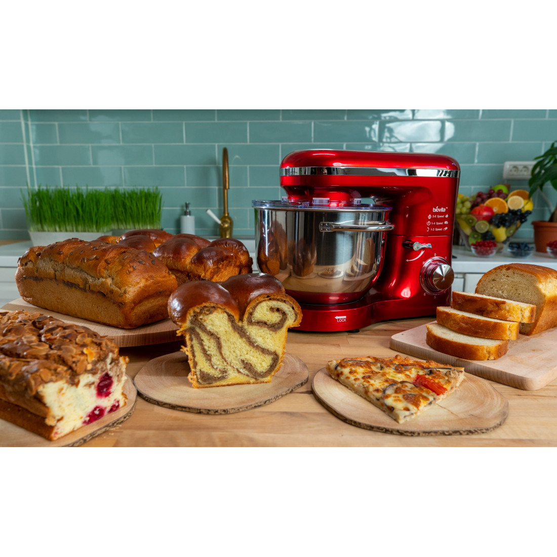 Mixer cu bol de 6L din inox, MB-1500PRO, 2 kg aluat, putere 1500W, 4 accesorii, 6 viteze + puls, Roșu