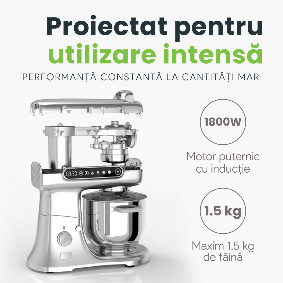 Motorul puternic de 1800W îți oferă forța necesară pentru cele mai dense aluaturi, menținând o funcționare surprinzător de silențioasă, sub 69 dB. Mișcarea eliptică asigură acoperirea întregii suprafețe a bolului pentru o omogenizare rapidă și eficientă, fără a lăsa ingrediente neprocesate.