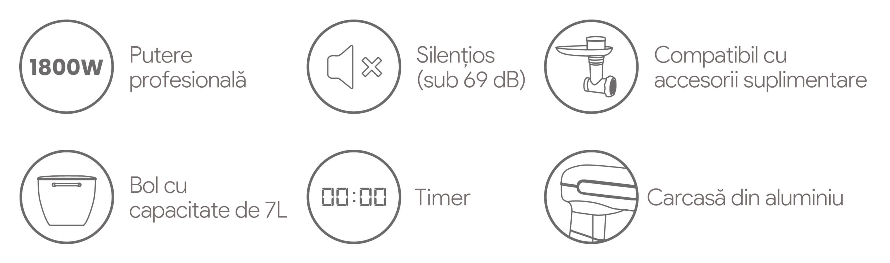 | Accesorii incluse | Tel din inox, cârlig din inox pentru frământare, paletă de amestecare din inox, paletă cu lamele de silicon |