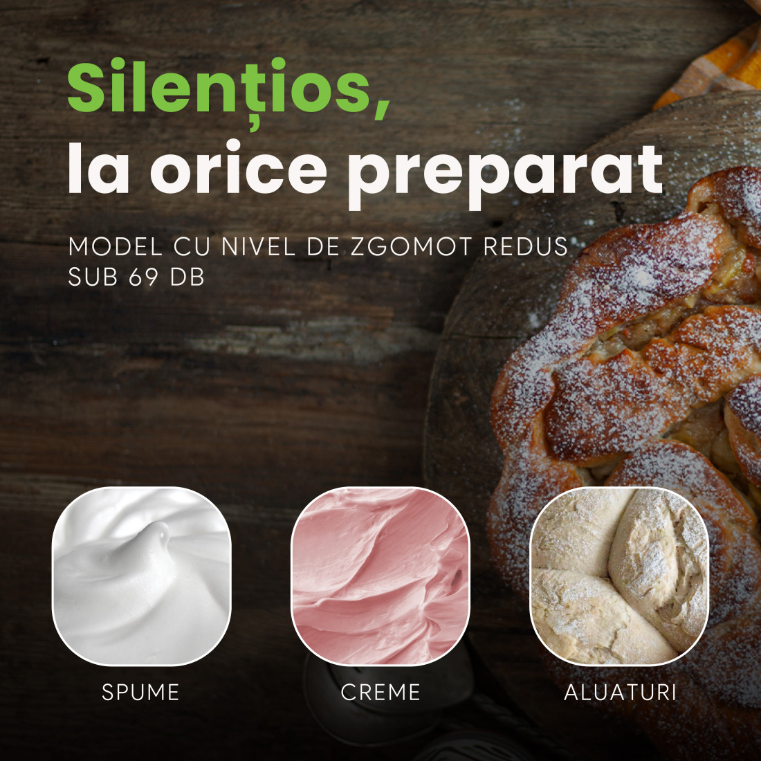 Motorul puternic de 1800W îți oferă forța necesară pentru cele mai dense aluaturi, menținând o funcționare surprinzător de silențioasă, sub 69 dB. Mișcarea eliptică asigură acoperirea întregii suprafețe a bolului pentru o omogenizare rapidă și eficientă, fără a lăsa ingrediente neprocesate.