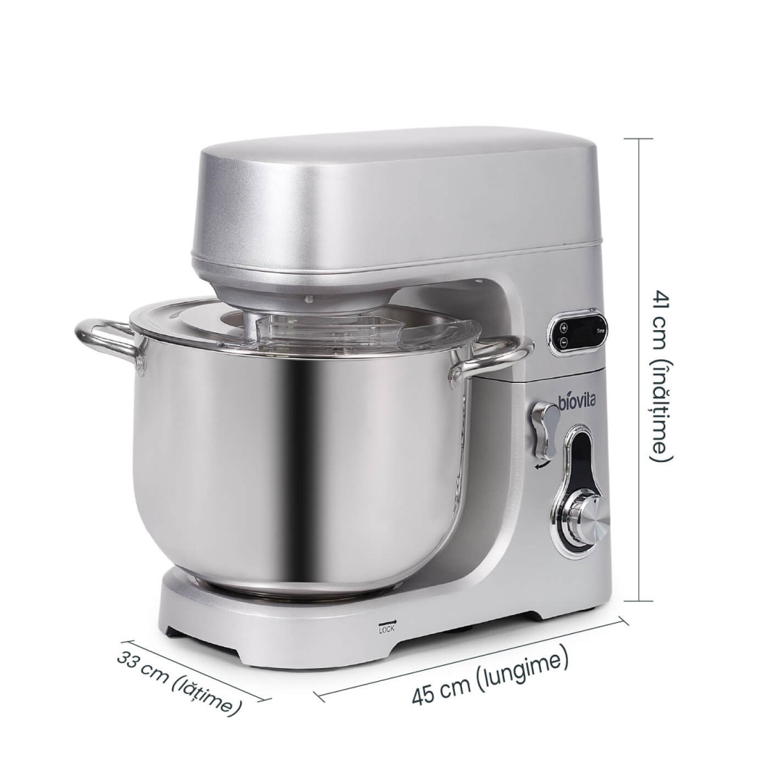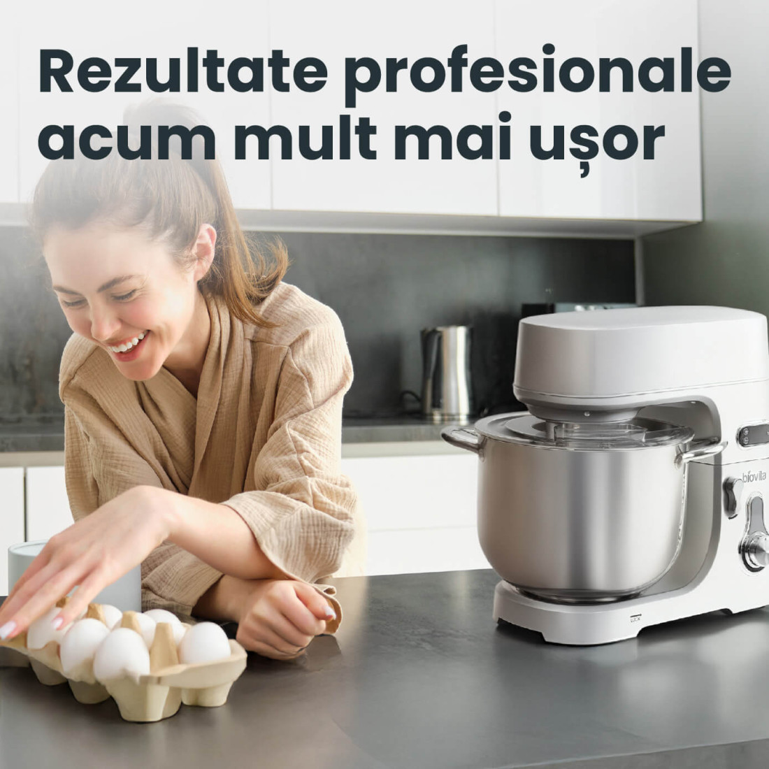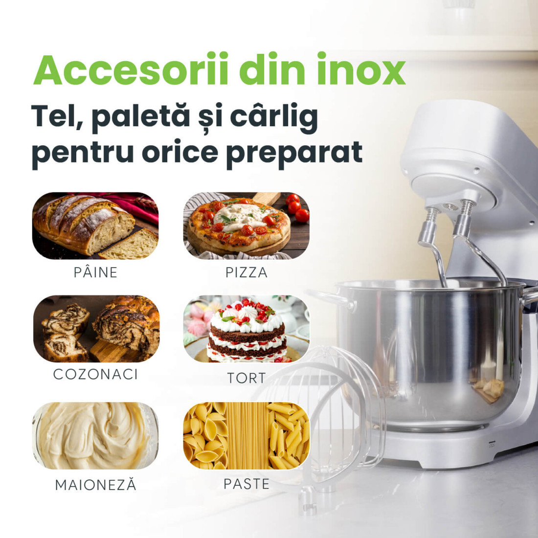 Construcția robustă cu carcasă metalică împreună cu accesoriile din inox pentru frământare și mixare, garantează performanța pe termen lung.