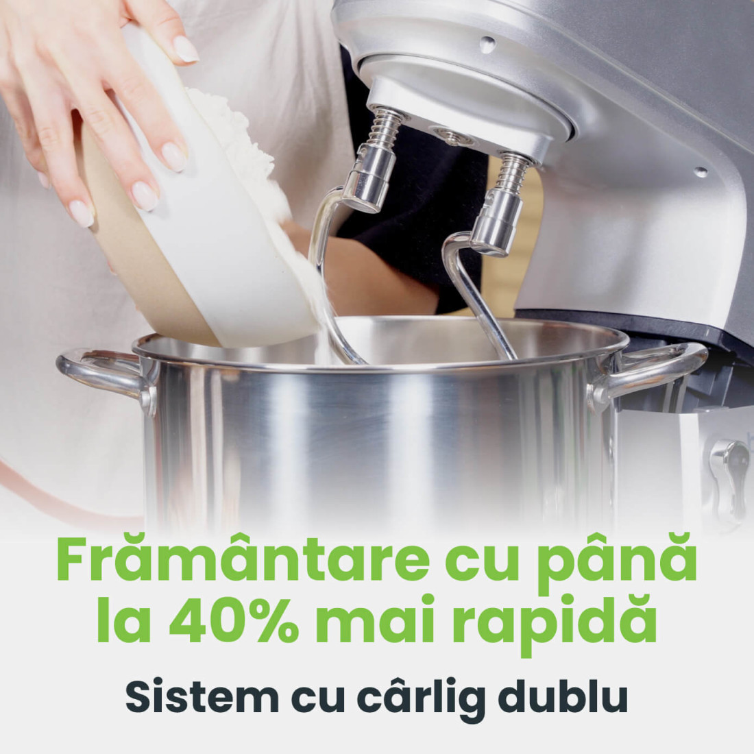 Sistemul de frământare cu cârlig dublu face ca frământarea să fie cu până la 40% mai rapidă și eficientă decât la mixerele tradiționale cu un cârlig.
