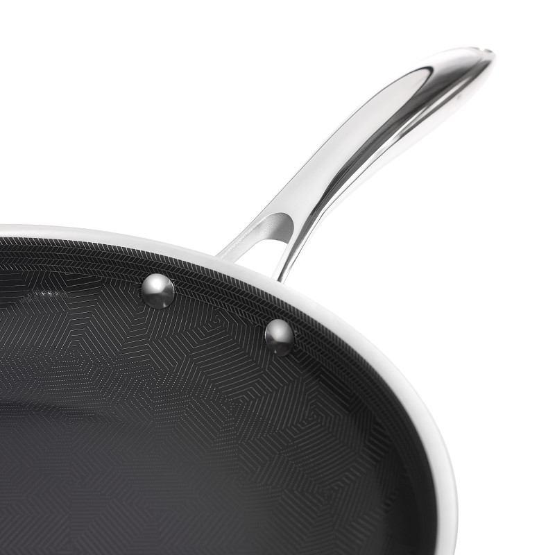 Tigaia combină rezistența inoxului cu avantajele unei suprafețe ceramice antiaderente. Suprafața hibridă îți reduce considerabil cantitatea de ulei necesară la gătit, ceea ce înseamnă preparate mai sănătoase și mai gustoase. Alimentele nu se lipesc, iar tigaia se curăță rapid, chiar și după utilizare intensă.