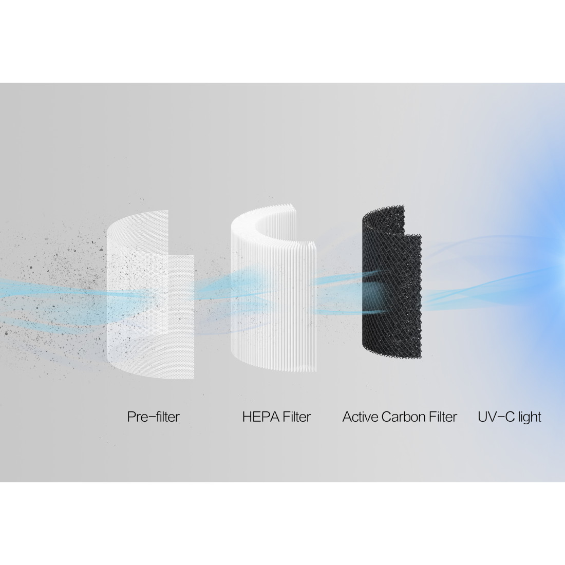 Filtrul dispune de 3 nivele de filtrare: pre-filtru, filtru HEPA și un filtru cu cărbune activ, asigurând astfel o eficiență ridicată de filtrare.