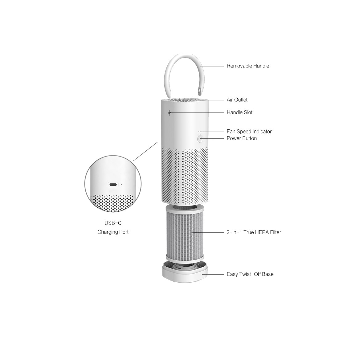 - Acumulator din Litiu: Purificatorul dispune de baterie reîncărcabilă din Litiu de 2600 mAh, pentru a-l putea folosi oriunde avem nevoie. Acesta se încarcă la maxim în aproximativ 4 ore, folosind un cablu USB-C inclus.