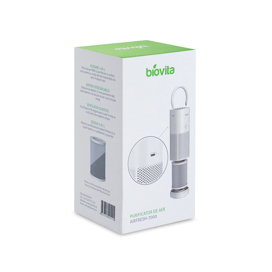 Purificatorul de aer pentru casă Biovita Airfresh-7000, cu filtru H13 HEPA, elimină 99.95% din mirosuri, fum, polen și alergeni. Acum te poți bucura de aer proaspăt oriunde ai fi. Potrivit pentru suprafețe de până la 5 m², având CADR 10 m³/h.