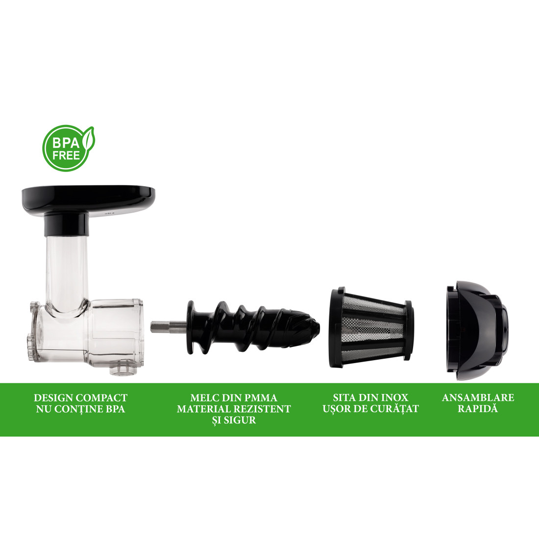 | Compoziție | melcul și sita sunt din PMMA, iar celelalte componente din plastic fără BPA. |