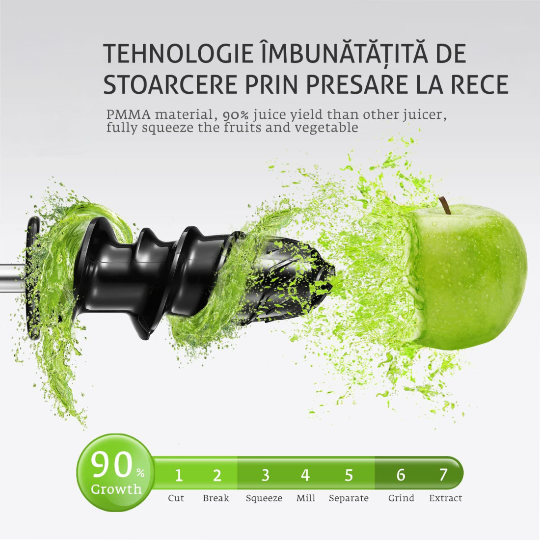- Tehnologie de stoarcere lentă cu melc vertical – Obții cu până la 30% mai mult suc și 40% mai multe vitamine față de un storcător centrifugal. Sucul este mai dens, mai puțin oxidat și păstrează enzimele intacte.
